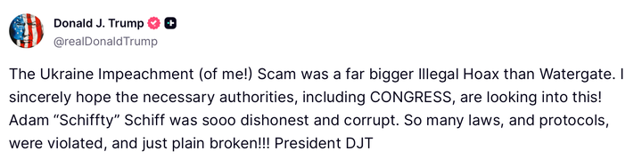 “The Ukraine Impeachment (of me!) Scam was a far bigger Illegal Hoax than Watergate. I sincerely hope the necessary authorities, including CONGRESS, are looking into this! Adam “Schiffty” Schiff was sooo dishonest and corrupt. So many laws, and protocols, were violated, and just plain broken!!! President DJT”