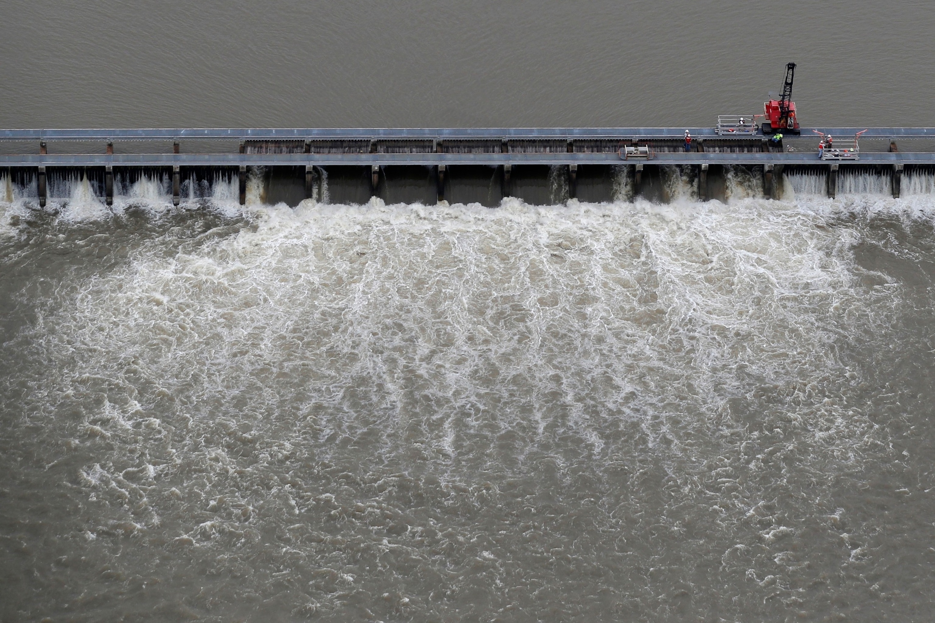 Workers open bays of the Bonnet Carre Spillway, to divert rising water from the Mississippi River to Lake Pontchartrain, in Norco, La., May 10, 2019. Gerald Herbert/AP
