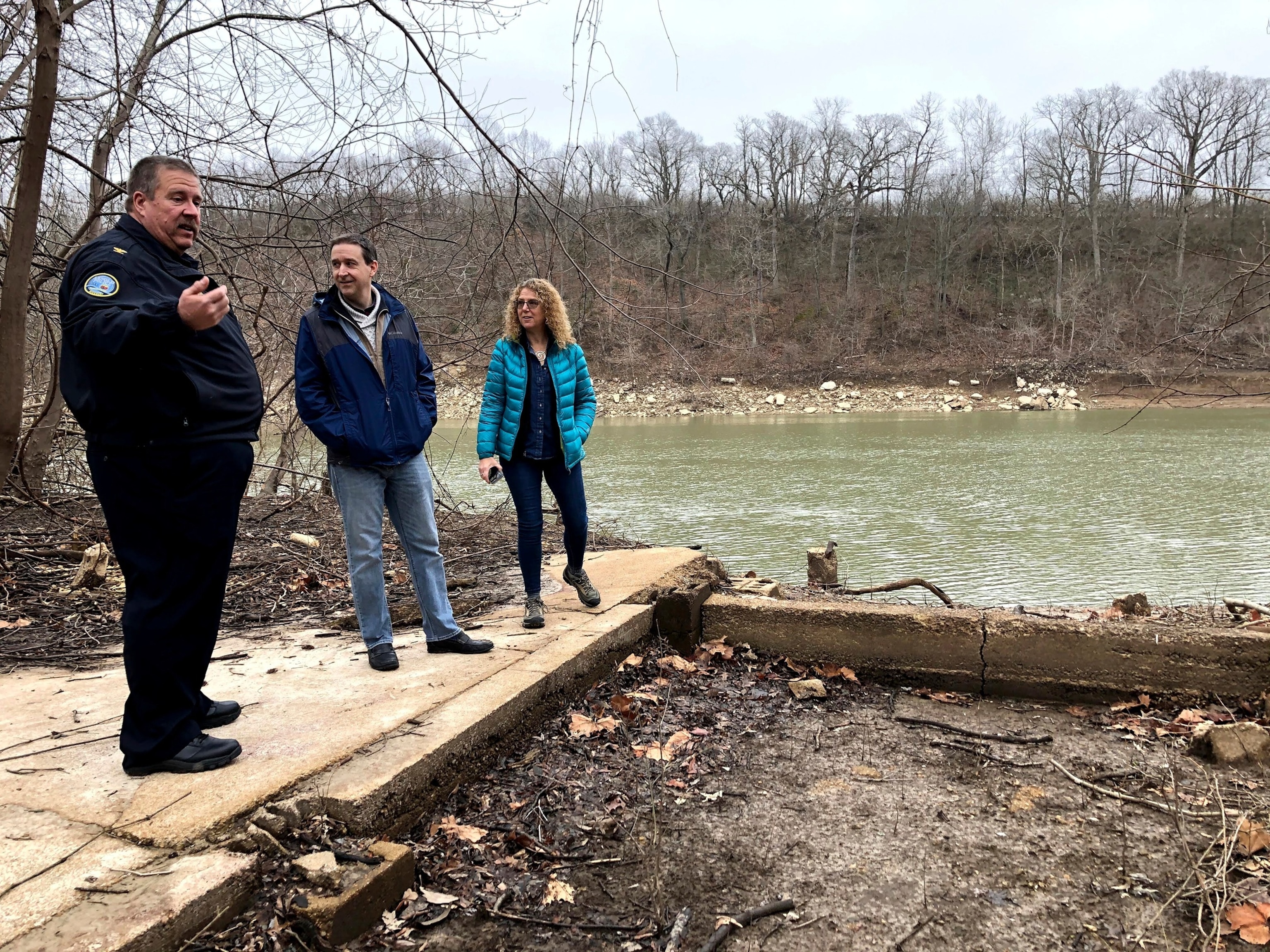 Police Chief Robert Shockey, Colin Wellenkamp of the Mississippi River Cities and Towns Initiative; and Barbara Charry of The Nature Conservancy examining the ruins of an abandoned house along the Meramec River in Arnold, Missouri, March 10, 2020. John Flesher/AP