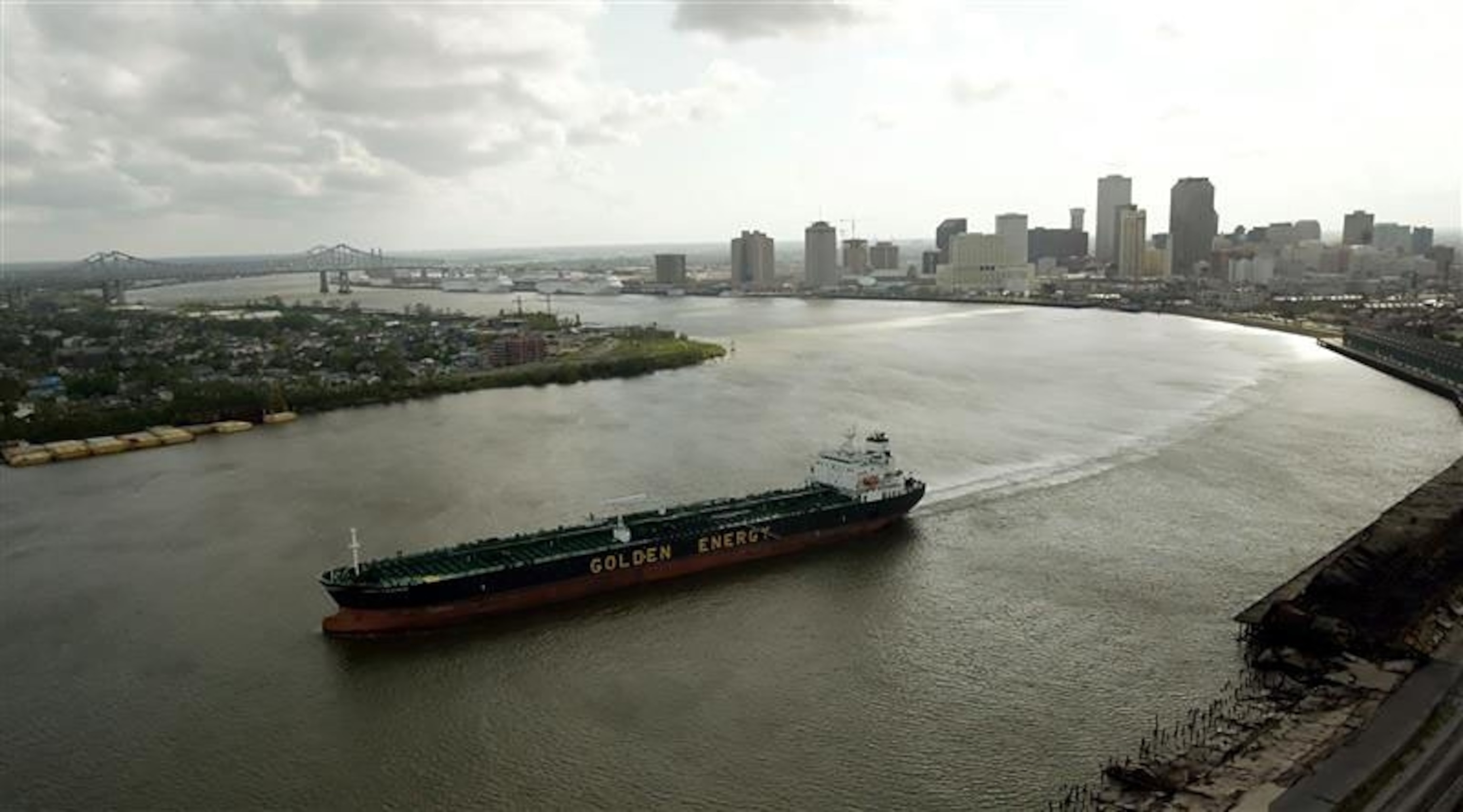 A tanker ship travels along the Mississippi River near downtown New Orleans, Sept. 25, 2005. David J. Phillip/AP